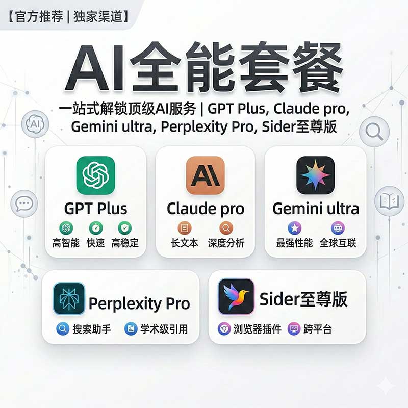 告别繁琐的海外多平台注册与高昂的独立订阅费用。只需一份超低月租,即可一次性将全球第一梯队的 AI 生产力工具全部收入囊中,彻底打通你的超级工作流。